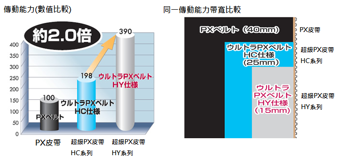 傳動能力是超級 PX 皮帶 HC 系列的 1.3~2.0 倍,適用於高頻率裝置和減少重量。
